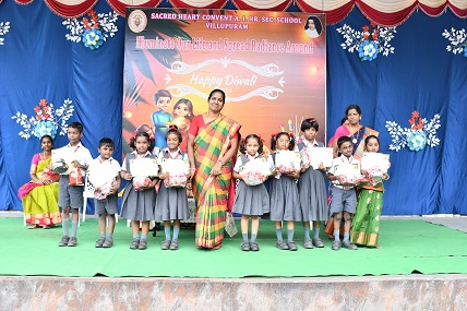 The Diwali celebration at [Sacred heart] was a vibrant spectacle that enveloped the entire school in a joyous atmosphere. From the meticulously crafted rangoli designs to the colorful boards that adorned every corner, the premises radiated festive cheer. The cultural program unfolded with energetic dance performances, skits, and musical renditions, showcasing the diverse traditions associated with Diwali. Both students and teachers added to the festive spirit by donning traditional attire, creating a visual feast of cultural diversity.